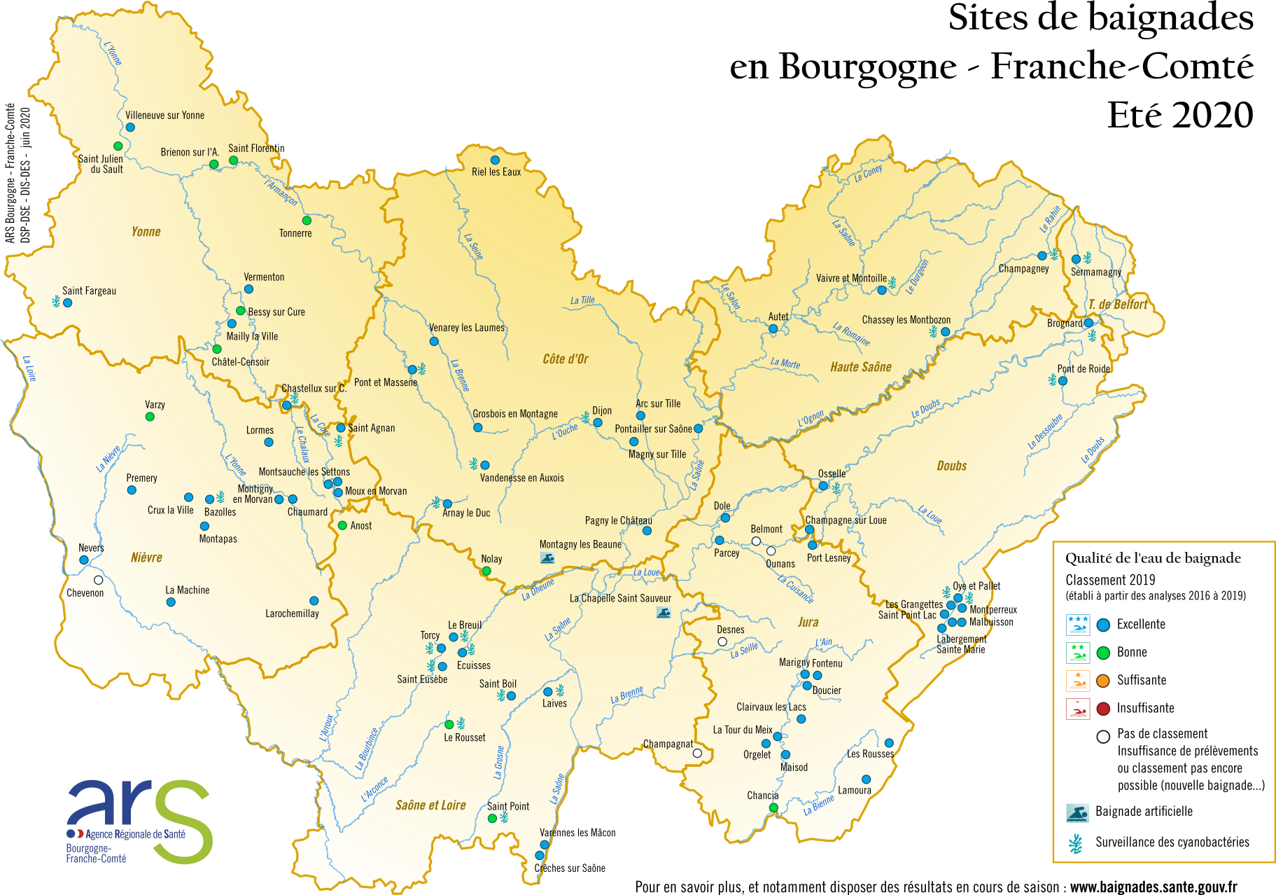Sites de baignades en Bourgogne-Franche-Comté en 2020